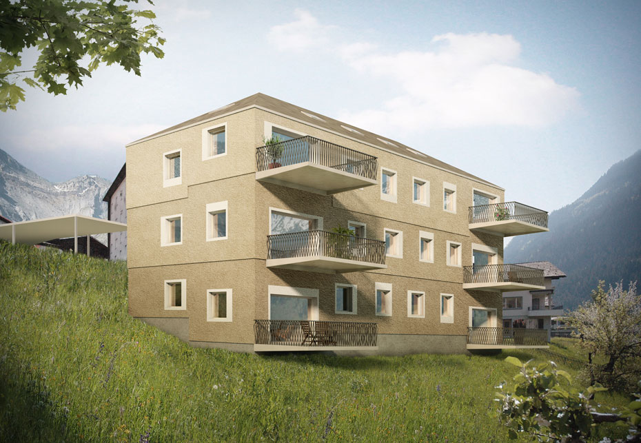 Das Mehrfamilienhaus befindet sich im Dorfzentrum von Rabius. Das Grundstück ist leicht abfallen, was im Schnitt eine Abstufung der Geschosse ermöglicht. Auf diese Weise verfügt jedes Geschoss über einen überhöhten Wohnbereich. Die Fassade interpretiert das traditionelle Erscheinungsbild bestehender Bauten.