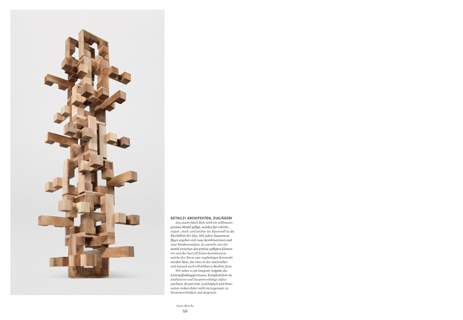 Aus einem Stück Holz wird ein millimeter- genaues Modul gefügt, welches frei schicht-, stapel-, steck- und setzbar ist. Essenziell ist die Flexibilität der Idee. Mit jedem Zusammen- fügen ergeben sich neue Kombinationen und neue Strukturansätze. Es entsteht eine Dynamik zwischen den präzise gefügten Elementen und der lustvoll freien Kombination, welche den Turm zum waghalsigen Konstrukt werden lässt, das stets in der materiellen und statisch nachvollziehbaren Realität fusst. Wir sehen es als integrale Aufgabe des Lösungsfindungsprozesses, Komplexitäten zu analysieren und Zusammenhänge aufzu- zeichnen. Kreativität, Leichtigkeit und Inno- vation stehen dabei nicht im Gegensatz zu Verantwortlichkeit und Anspruch.